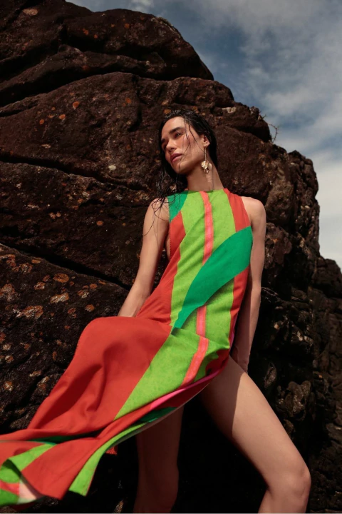 Esta saída de praia se destaca pelo seu detalhe de amarração lateral, conferindo um toque delicado e sensual, além de possibilitar ajuste personalizado para um caimento perfeito. Seu modelo fluido proporciona liberdade de movimento, tornando-a uma peça versátil para usar sobre biquínis ou maiôs.